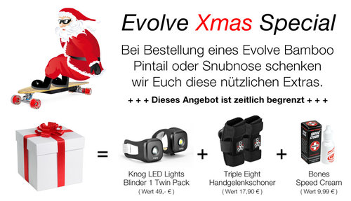 Ab Montag bieten wir Euch ein Xmas Special bei Evolve. Seht selbst: http://www.evolveskateboards.de/ Bei Bestellung eines Evolve Bamboo Pintail oder Snubnose ( egal mit welcher Rolle ) schenken wir Euch: - unseren LED Lights Bestseller, das Knog Blinder 1 Twin Pack (Wert 49 Euro), wasserdicht, wiederaufladbar per USB und blendend hell. Gerade in der dunklerern Jahreszeit nützlich. - Triple Eight Handgelenkschoner (Wert 17,90 Euro) . Guter Schutz durch Doppelschienen, trotzdem liegt die Fernbedienung gut in der Hand. Sicherheit geht vor. Und so ein Sturz passiert schnell (weß ich aus eigener Erfahrung) - Bones Speed Cream (Wert 9,99 Euro), gut geölte Kugellager laufen besser und leben länger.