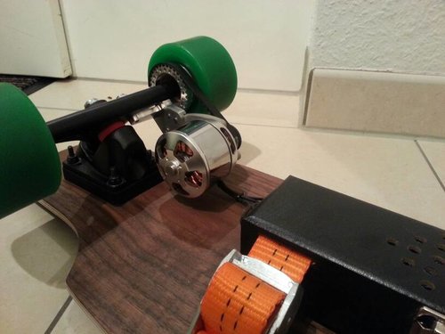 @Beatbuzzer: Super...Danke schon mal. Werde ich morgen mal testen ob es daran liegt. Wäre sehr froh wenn es sich so einfach beheben ließe. @Nicolas: Ich hab die Programmbox. Denke da müsste eigentlich soweit alles passen. Drag Brake hab ich auf 0%. Oder liegt das an einer anderen Einstellung? Hier die ersten Fotos. Ich habe Spanngurte mit Flachhaken (die ich mit schwarzem Plastidip dreifach gummiert habe) verwendet. Das sitzt bombenfest. Selbst mit Gewalt lässt sich da nichts verrutschen. Die Box ist ein Billard-Koffer, in welche diese Art von Lipo zufälligerweiße perfekt auf den Millimeter reinpasst. Ich habe diesen auf ungefähr die Hälfte gekürzt, Scharniere und Schnallen versetzt, Lüftungslöcher, Kabelausgänge und eine Aussparung für den An/Aus-Schalter gesägt/gebohrt. Regler und Empfänger habe ich mit Pattex "Kleben statt Bohren" doppelseitigem Klebeband eingeklebt. Hält super und lässt sich trotzdem bei Bedarf wieder lösen. Damit habe ich auch 2 dünne Skateboard-Shockpads unten an die Box geklebt, um Vibrationen zu dämpfen, die Box am verrutschen zu hindern und um ein bißchen Raum für den Flex des Boards zu lassen. Evtl. Kommt noch ein Schriftzug mit grünem Plastidip (passend zu den Flywheels) auf die Box. Aber vielleicht lass ich es auch einfach so schlicht wie es jetzt ist. Der Rest ist eigentlich Standartprogramm. Schön an der ganzen Sache ist, dass ich das Setup an verschiedenen meiner Boards verwenden kann, ohne bohren zu müssen. Lässt sich innerhalb von 3 Minuten von dem einem auf ein anderes meiner Boards wechseln.(mit Mini-Akkuschrauber versteht sich )