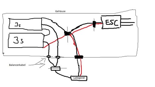 18. Also ich habe 2x 3s in Serie: Ich habe mir das so vorgestellt + ein Stecker führt zum ESC der andere aus der Box? In dem wunderschön gezeichneten Anhang steht die Verkabelung, wenn da ein dünner Strich durchgeht, bedeutet das, dass da ein Stecker ist. Kann der Akku geladen werden, während noch die ganze Elektronik zusammen hängt ohne das was kaputtgeht bzw. an geht? Grüße