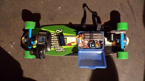 Moin, heute mit meinem ersten Elo-Board gefahren...das macht Spass und die Finger sind kaaaaalt...aber trotzdem waaaassss nen SPASS:D noch ein wenig Daten: -ADS Antriebsset 36/14 auf Calliber-Trucks -Motor C6354 200kV -Regler Hobbywing EZ-Run -Lipo 6s 5200mAh Wellpower -Abec 11 Flywheels 76mm 81A -Technikbox is ne Brotzeitbox -Funke...ne billige Carson die noch rumlag, wird aber noch verkleinert So...das Board ist sozusagen der Einstieg, nen ATB ist schon in Planung, da werd ich bestimmt noch mit Fragen nerven...obwohl...viele Fragen gibts da nicht, steht ja schon fast alles in diesem netten kleinen Forum:thumbsup: MFG, Oli