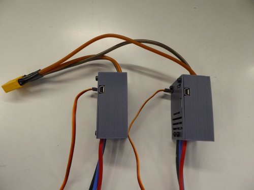 Fertig verkabelt schauts dann so aus. Ich leg beide Regler parallel auf einen XT90, baut dann etwas kleiner (-; Und ja ich nutze tatsälich nicht den CAN-Bus, sondern splitte gewohnt das PPM Signal (-: