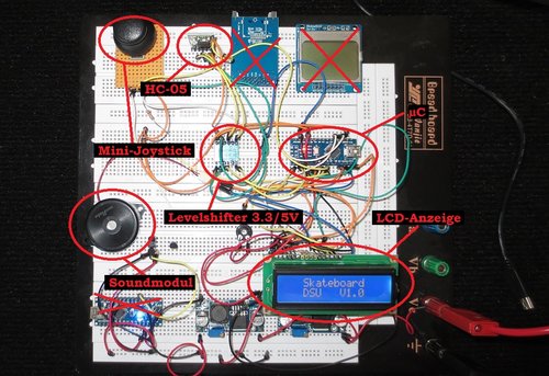 Soooo... nachdem ich endlich die ersten Teile aus China bekommen habe, habe ich mal eine kleine Versuchsanordnung gemacht (siehe Anhang). Als Eingabemedium habe ich einen Mini-Joystick mit Tastfunktion gewählt. Dieses deshalb, weil nur drei Eingänge am Arduino belegt werden. Poti rauf/runter = Menü durchblättern Poti links/rechts = Menüwerte ändern Tastfunktion = Enter/Bestätigen Und durch die Wahl eines Potis statt Eingabetaster kann man auch eine Geschwindigkeitsabhängige Werteänderung vornehmen. So kann man bei großen Zahlenwertunterschieden schnell dort "hingespullt" werden. Das Bluetoothmodul (HC-05) ist auch schon verdrahtet und programmiert mit Name & 115200 Baud. ich habe das Projekt "E-Skateboard DSU" genannt. DSU steht für Direkt Setting Unit" ToDo: - Programm schreiben *Grundgerüst *BT-Anbindung *Temparatur *Speicher für verschiedene Settings - Gehäuse - DSU auf Akkubetrieb umstellen (LiPo 3,7V & DC-Step-Up Chinamodul) - Akkuladeelektronik (China-Modul) - Temparatursensor(en) integrieren (DS18b20) *Umgebungstemparatur *Fühler für externe Messung (z.B. Asphalt, Fahrakku, Motor am E-Skateboard, Angstschweiß...) - RTC (?) Wünsche / Anregungen ??? @Barney Wie viele Werte sollen eingestellt werden ? Wie lautet deren Name ? Welcher jeweilige Werte Bereich ?