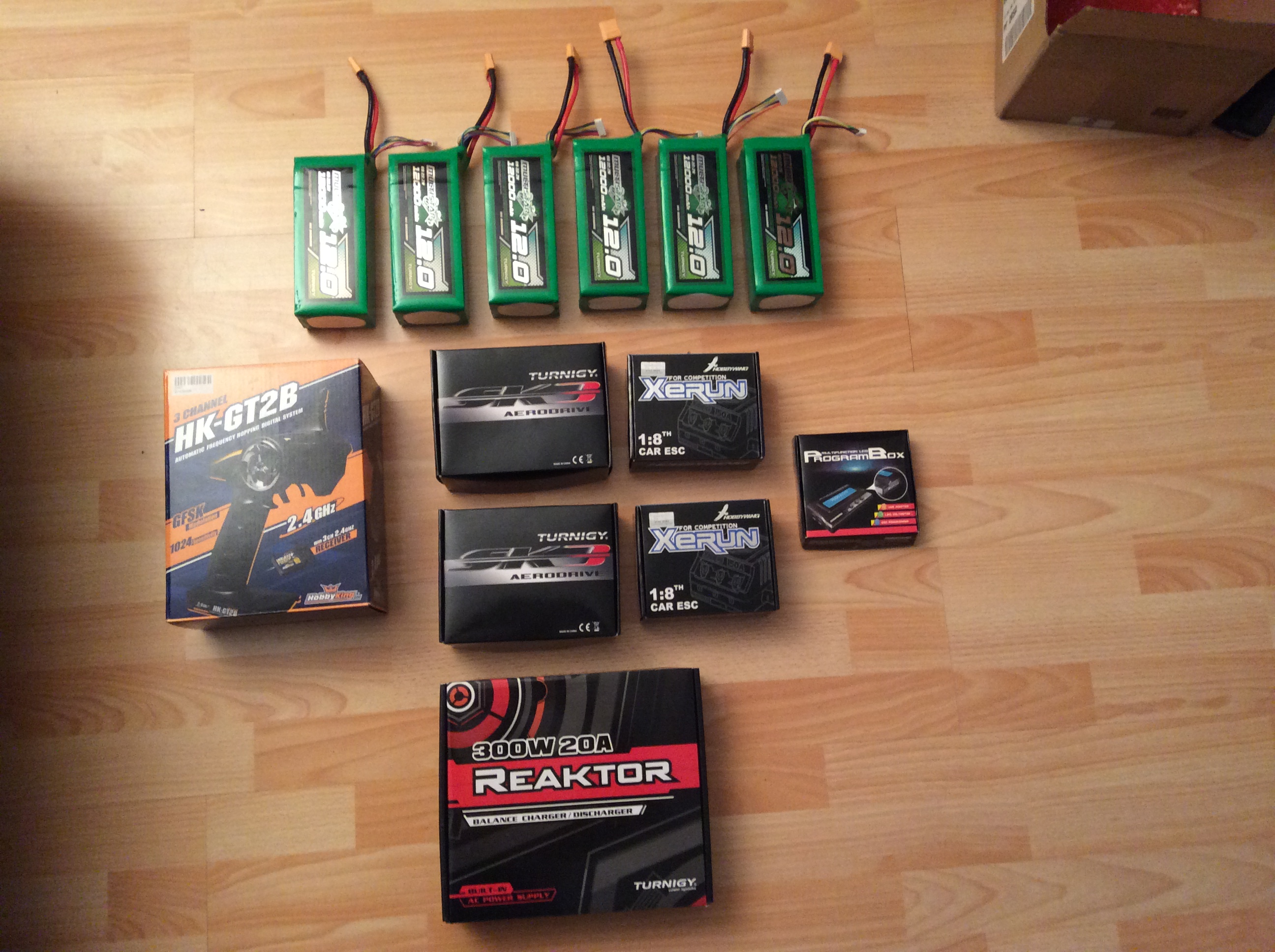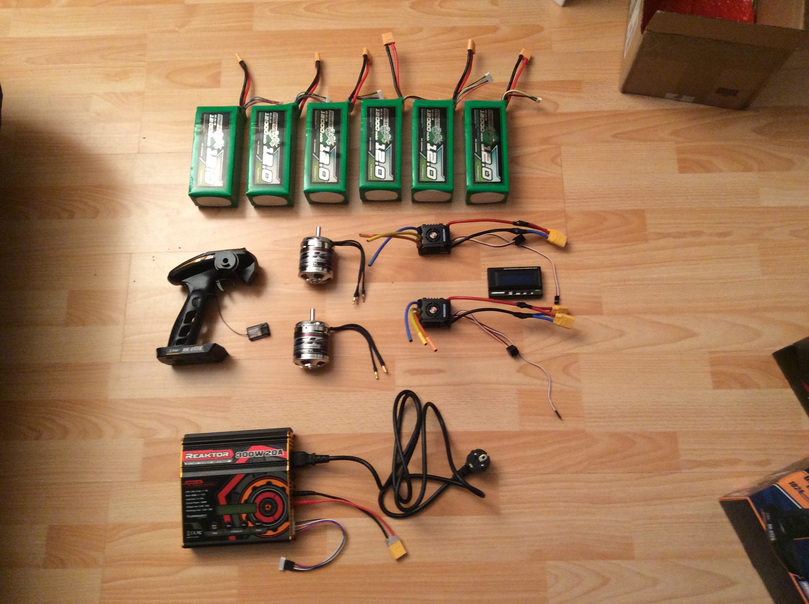 Ich hab jetzt endlich alle Komponenten für meinen Traum Bord deshalb will ich euch jetzt davon erzählen. An der Stelle auch gleich noch einmal vielen Dank an alle die mich bei der Offroad Meisterschaft ihre Bords testfahren lassen haben und mit mir gefachsimpelt haben. Es hat mir sehr geholten einen Eindruck zu bekommen was ich möchte und dafür brauche :-) Antriebsstrag: 72 Ah Batterie 6 x MultiStar High Capacity 6S 12000mAh € 540 Motor Controller 2x XERUN 150A +Programmer € 200 Motor 2 x Turnigy Aerodrive SK3 - 6364-245kv Brushless Outrunner Motor € 120 Ich denke mal damit kann man lange schnell fahren :-) Achsen & Räder 8“ von MBS 415€ MBS Matrix Pro Truck – Gold MBS Rockstar II Hubs – Orange MBS Roadie Tyres – Purple MBS 8" Tube , MBS Matrix Bearings Riemen Übersetzung 1:4 von maedler.de 100€ HTD-Zahnriemenrad aus Aluminium Profil 5M 72 Zähne für Riemenbreite 15mm Artikel: 17237200 HTD-Zahnriemenrad aus Stahl Profil 5M 18 Zähne für Riemenbreite 15mm Artikel: 17231800 HTD-Zahnriemen Neopren Profil 5M Breite 15mm Wirklänge 450mm Zähnezahl 90 Artikel: 17332200 Deck Longboard deck Rohling 2 Stück (eins extra zum probieren) 75€ LadegerätTurnigy Reaktor 300W 20A AC/DC Synchronous Balance Charger € 95 FernbedienungHobbyKing HK-GT2B 3CH 2.4GHz € 20 Jetzt die Bilder: