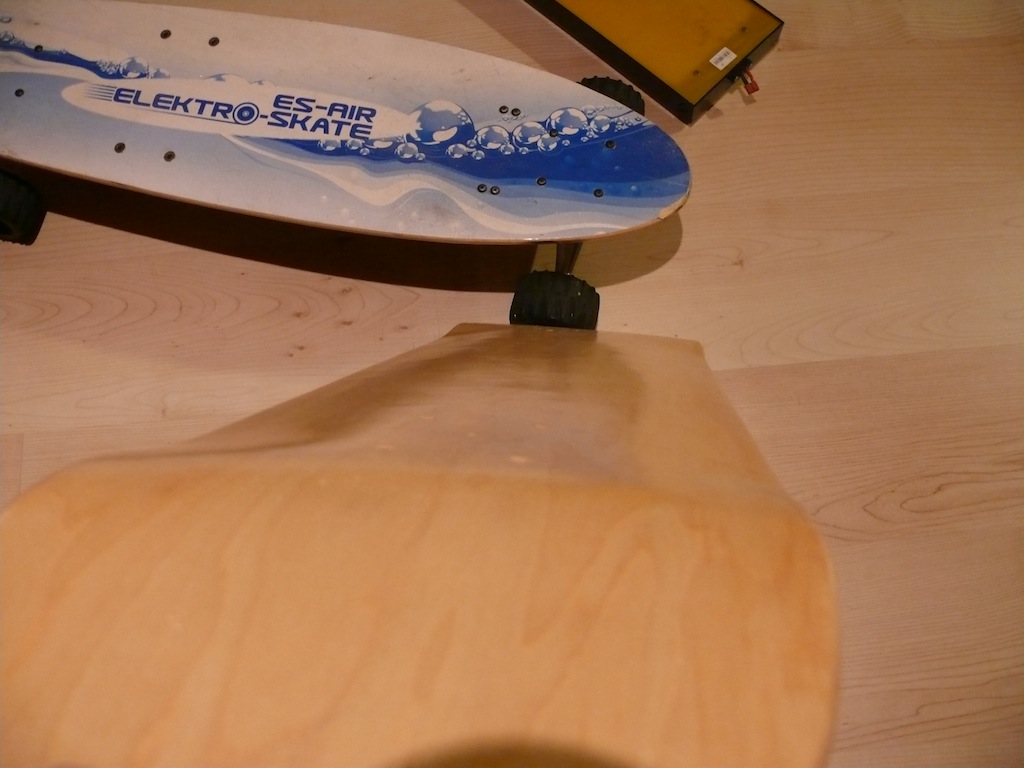So hab das es 400 zerlegt und die Teile auf des Pogo Brett gelegt um zu sehen ob zwischen den Achsen genug Platz für die Elektronik ist. Ich glaube fast der Platz reicht nicht. Die Achsen müssten so weit nach außen wie es geht, weiter als die Standardbohrungen sind, dann könnte es gerade so passen aber grad so. Denke das wird mit dem Pogo Hammerhead 95cm nix und muss es gegen das 105cm Deck umtauschen Schade weil das original elektroskate Deck ist nur 91cm lang, hat dafür aber nur n kurzes Tail und praktisch gar keine Nose. Weiß halt nicht wie sich das Board dann so fährt wenn die Achsen so weit außen sind. Wie sich Wheelies machen lassen und so. Ollies gehn auf gar keinen Fall aber kein Plan ob die mit dem 105cm Deck gehen würden. Ein andres Problem ist die Elektronik und das Konkav des Decks. Da das orig. es Deck kein Konkav hat ist der Akkukasten und die ControllerBox plan. Unter dem Pogo Deck bleibt links und rechts ne Lücke. Bin noch am überlegen wie man die Spalte schließen kann ... (MrConstruct3 ?) Ansonsten gefällt mir das Pogo Deck richtig gut!