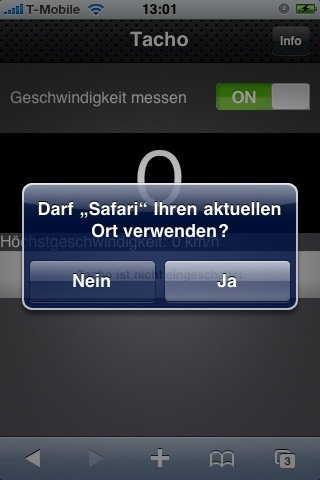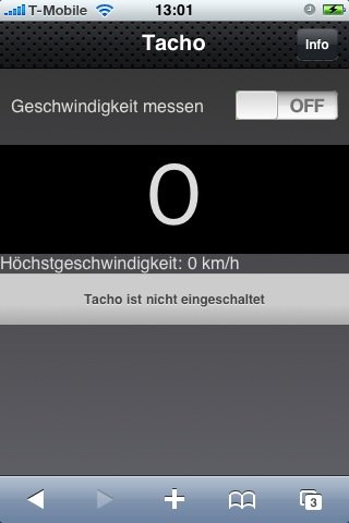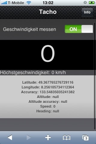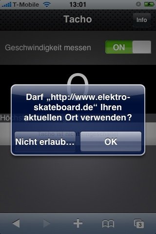 Die erste Testversion unserer Elektro-Skateboard iPhone WebApp ist online. In der ersten Version gibt es genau eine Funktion: Das Anzeigen der momentanen Geschwindigkeit und die Höchstgeschwindigkeit die erreicht wurde. Es ist kostenlos und wurde für das iPhone entwickelt, sollte aber auch mit anderen Smartphones welche GPS und einen HTML5 fähigen Browser haben funktionieren. Zum ausprobieren einfach mit dem Safari-Browser des iPhone auf www.elektro-skateboard.de/iphone surfen. Schaltet man den Tacho das erste Mal ein muss man die Verwendung des GPS bestätigen. Momentan wird neben der Geschwindigkeit noch die komplette Ausgabe des GPS angezeigt, es ist wie gesagt noch eine Testversion. Feedback zur App könnt ihr hier posten Übrigens kann auch Firefox HTML5, er versucht die Positionsdaten dann über die IP-Adresse zu ermitteln. Sinn macht das hier keinen aber wer die Lokalisierungsfunktion mal testen möchte kann dies auch auf dem Computer mit Firefox tun. Screenshots: Tipps zur Benutzung: 1. Die automatische StandBy Funktion deaktivieren. Ansonsten schaltet das iPhone während dem Messen, je nach eingestellter Zeit, auf Standby. 2. WebApp zum Home-Bildschirm des iPhone hinzufügen. Das ist quasi ein Safari Bookmark der wie eine App aus dem Appstore auf dem Homebildschirm angezeigt wird. Vorteil ist das man schneller darauf zugreifen kann und die Webapp im Fullscreen Modus angezeigt wird.