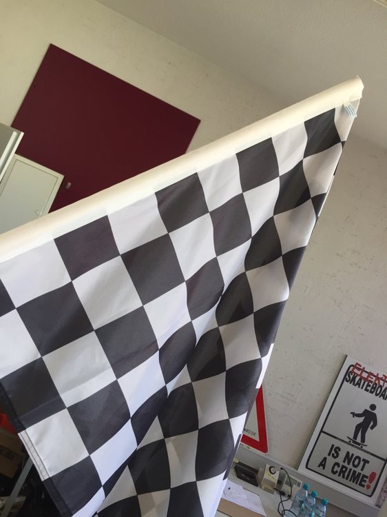 Die neue Zielflagge ist eingetroffen. Sie entspricht den Richtlinien der FIA und der FIM, dem Internationalen Sportgesetz (Automobil) und den allgemeingültigen Bestimmungen für den Straßensport (Motorad) und selbstredend auch den noch zu definierenden internationalen Elektro-Skate-Sport Vorgaben.