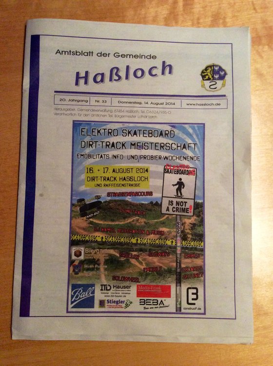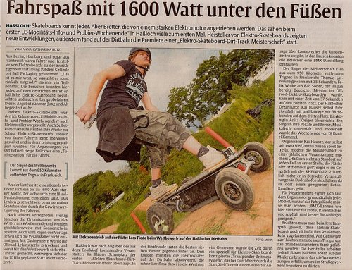 13. Ich hätte nie gedacht das überhaupt jemand von unserem Event, der ersten Elektro-Skateboard Dirt-Track Meisterschaft, berichtet und jetzt war an beiden Tagen die Rheinpfalz vor Ort, hat interviewt und Fotos geschossen. Am Samstag war das Rhein Neckar Fernsehen da und bringt diese Woche einen Beitrag. Am Sonntag war SWR da und hat Montags einen spannenden Bericht in der Landesschau über unseren Sport gebracht. Fotograf Günni Weinerth hat an beiden Tagen spontan den ganzen Tag Fotos geschossen, richtig geile Fotos. Rainer Steuer hat am Sonntag die komplette Meisterschaft gefilmt und schneidet uns ein hübsches Video das wir dann auf youtube setzen und im Offenen Kanal ausstrahlen.