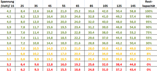 Vorschlag fürs Wiki: Schritt 2: Um einen Akku mit dem VESC vor Tiefenentladung zu schützen, sollten im BLDC Tool die Werte "Battery cutoff start" und "Battery cutoff end" gepflegt werden. Diese Werte befinden sich ebenfalls im Tab "Motor Configuration/Motor" unter "Other Limitis" im unteren rechten Fenster. (s. Screenshot oben) Anmerkung: Diese Sicherheitsfunktion ist erst ab der Firmware >1.12 und dem entsprechenden BLDC Tool verfügbar. Mit der Version <1.10, kann an dieser Stelle „duty cycle“ parametrisiert werden. Die Firmware sollte nicht nur deshalb upgedatet werden! Diese Tabelle zeigt die Spannung in Volt und die entsprechende Restkapazität von Lipo Akkus: Bild-Quelle: http://www.heli-planet.de/?section=lipo_02 Als Richtwert für die Zellenspannung gilt, dass diese nicht unter 3,3Volt je Zelle abfallen sollte. Beträgt die Zellenspannung weniger als 2,7 Volt, wird die Zelle dadurch beschädigt! -
