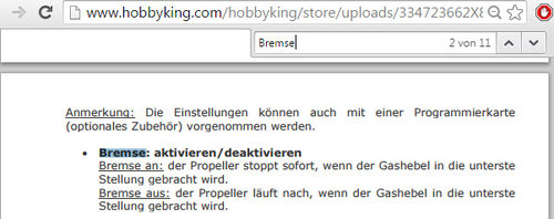 Die Frage richtete sich an das Bremsverhalten des ESC - wo man den Einbau ist schon klar. In der Doku steht das der Motor sofort stopp. Mit den ESC für die Autos kann man aber ganz fein und dosiert bremsen. Vielleicht hat ja jemand praktische Erfahrungen mit deinem ESC, wirst bestimmt nicht der Erste sein welcher an dieser Stelle sparren möchte. Hast du deinen ESC schon mal durch die Forumsuche gehauen?