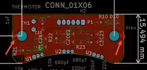 Habe mir die Abstände kurz mit einem OGP (digitales Messgerät) ausgemessen: Diode U1 = 1.40mm Abstand zum Motor Diode U2 = 1.53mm Abstand zum Motor Diode U3 = 1.80mm Abstand zum Motor Inputs: Eine zusätzliche SK3 Hallsensor Platine erstellen für einen 59mm Durchmesser. (Aktuell c63xx -> 63mm Durchmesser) Die Platine einen halben Millimeter zum Motor hin verschieben. Die Höhe der Füsschen einen Zentimeter nach unten korrigieren. Die seitlichen Ausschnitte des Originals brauchen wir wohl nicht. Eine passende PCB-Hülle aus Plastik als zusätzlicher Schutz wäre auch noch eine Idee. Der Abstand zwischen der Bohrung und der Aussenkante des PCBs gibt uns die Dicke der Füsschen vor. Da ich die Höhe korrigieren kann wird die Stabilität zunehmen. Gerne möchte ich das Füsschen aber ein bisschen dicker herstellen. Wenn dieses nicht überstehen darf, sollte man das Material zwischen der Bohrung und der PCB-Kante ein bisschen vergrössern.
