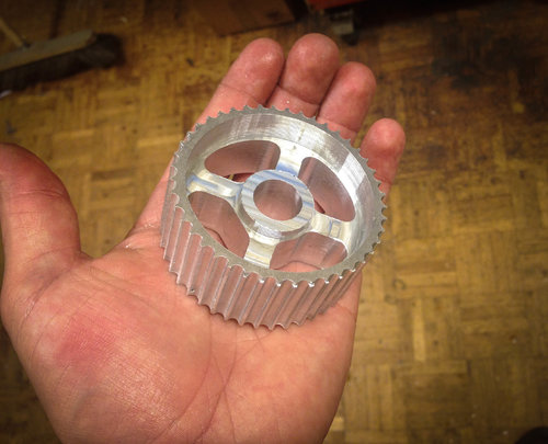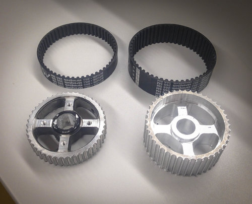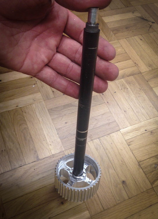 So, weitere kilometer sind gefahren worden, test's und änderungen sind am laufen Die Handfernsteuerung mit der Bremstaste hat sich soweit bewährt das ich keine proportional steuerbare bremse einbauen werde. passt soweit ! Die taste wird einfach über Wiederstände auf den potieingang geschaltet und gibt dem servo somit maximal ausschlag links oder rechts an. das problem des antriebsritzels direkt am motor ist nun auch gelöst. nun ist ein aus stahl gefertigtes HTD5 25mm ritzel dran welches nicht so schnell verschleisen solte wie das alu. auch das Antriebsriemenrad auf die achse musste somit angepasst werden. geht nun also vom motor mit 25 weg und teilt dann auf auf jedes rad, links/rechts mit einem 15er. denke das sollte so halten ! Die kleinen Antriebsräder welche auf die räder gehen zeigen jedoch auch schon abnutzungserscheinungen. diese werden dann auch noch auf stahl gerüstet aber das... erst nach dem event in Hassloch :cornut: einige impressionen vom alu klotz über den spänehaufen zum antriebsrad -