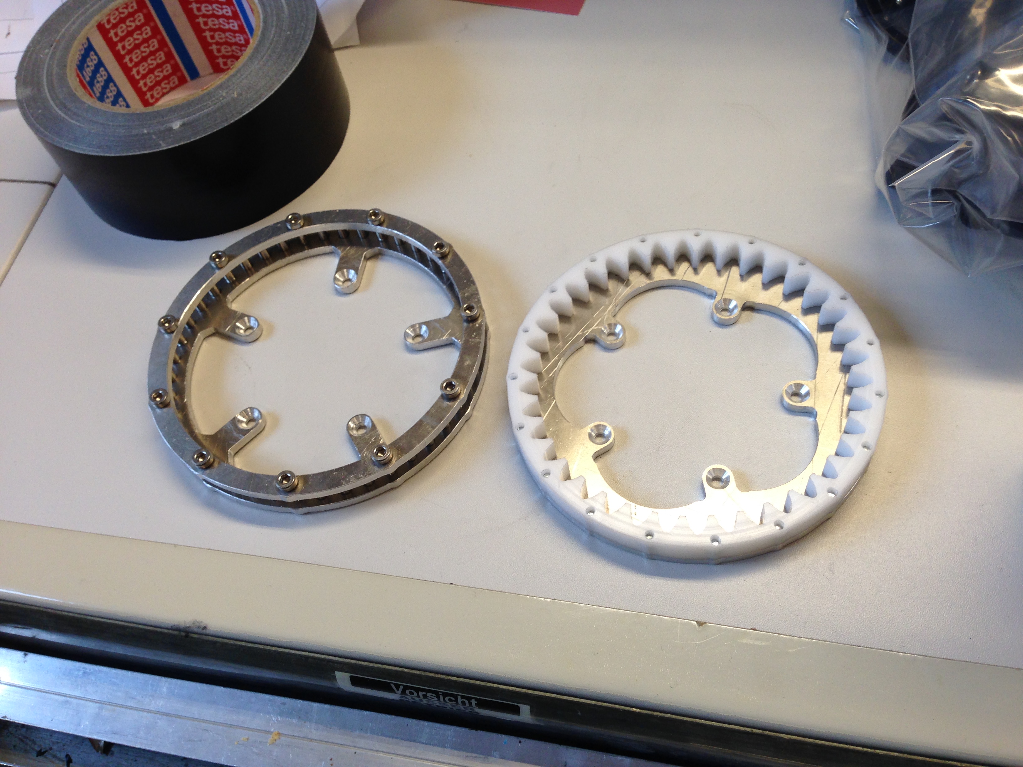 14. ...so in etwa zuerst der Pindrive versuche, gefräste Sandwich konstruktion mit Normbolzen, dann Innenzahnkranz... Das Coole am Pindrive währe halt gewesen das im falle von Dreck, dieser einfach durch das Zahnrad durch gedrückt würde Jedoch war das ein und aushängen des Rades nicht zufriedenstellend