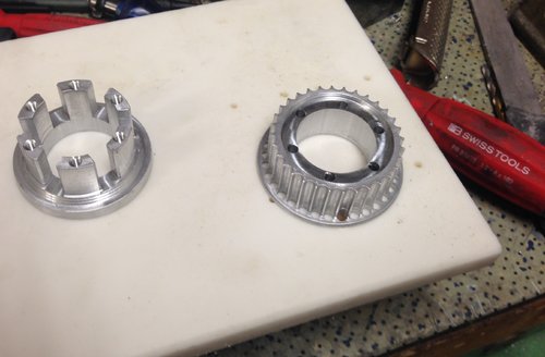so... um das schiff vorwärts zu bringen heute noch kurz die fräse angeschmissen. an räder kaufen denke ich schon gar nicht mehr sobald ich ein stück alu rummliegen sehe hehehe gefräst mit diesen zähnen die in das rad eingreifen, ist ja so standart mässig. anfangs schien der motor noch gross... irgendwie ist er aber klein zum brett passt gut ! natürlich kommt da noch ne deckscheibe ran das der riemen nicht runter springen kann -