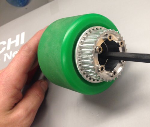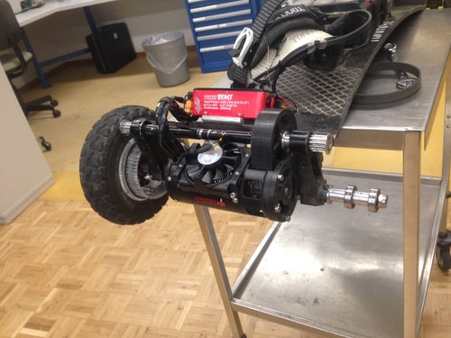 nun, die ganze bremse ist auf die neuen superstar felgen umgebaut. bei der hinterachse habe ich auch ein neues riemenrad gefrässt. dieses nun aber von 72 auf 60 zähne reduziert. -mehr bodenfreiheit -mehr platz für einen fix spanner (der federspanner muss weg) -beim antriebsrad geht der riemen um eineige grad mehr um das ritzel, was bessere kraftübertragung gewährleistet -da der motor mit ca 90rpm weniger dreht als der vorgänger wollte ich das anpassen damit das brett wieder gleichschnell fährt (40km/h normal, 50km/h race und volle leistungsausbeute) erste testfahrten habe ich schon hinter mir, muss sagen... ist wie ein schlag ins gesicht wenn man den trigger zieht :cornut: