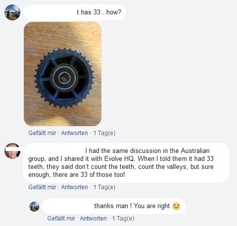 Was die 33 Zähne angeht, da hat Evolve selber keine Ahnung (siehe Kommentar) Die schieben wahrscheinlich gerade Panik weil sie jetzt alles auf 33 Zähne anpassen müssen, also Remote-Software, ihre Videos, Webseite, Geschwindigkeitsangaben, das ja alles zu 3% falsch, das kann ne Weile dauern.