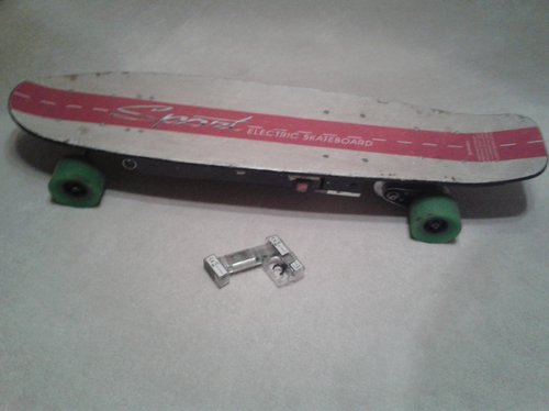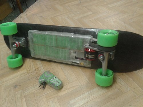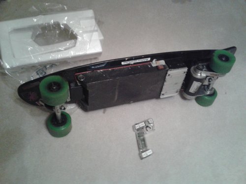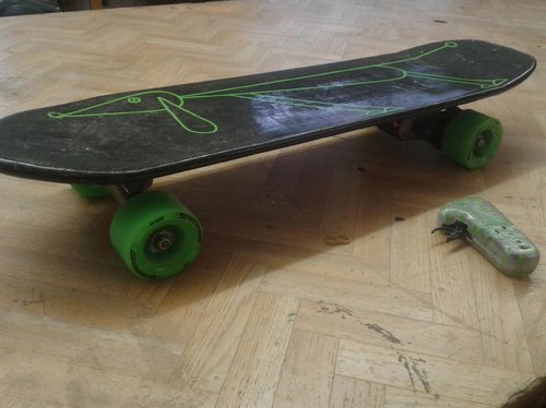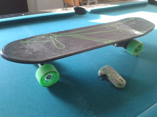 Hallo Gemeinde, nachdem ich mit Hilfe hier aus dem Forum für meine Tochter ein eigenes E-Skateboard (Ranis) zusammen geschustert habe, verkaufe ich hier das " Alte" von ihr. Angeboten wird ein Board l=ca.110cm mit einem 600W Bürstenmotor. Fernbedienung ist auch dabei. Mit 4Stk Akku (10Ah) bringt es ca.17kg auf die Waage. Ich hatte das Teil ohne Akkus und ohne Akkukasten erstanden. Diesen habe ich aus Kohlefaser selbst laminiert. Ich habe das Board mit 4 Stk 5S 5000mAh LipoAkkus befeuert. Das Board funktioniert super und hat auch ausreichend Power. Mit dem wurde auch die Freundin meiner Tochter auf ihrem Longboard am Seil eine steile Strasse rauf gezogen. Mit der Fernsteuerung sind 3 Leistungsstufen einstellbar. Mit der ersten ist die Geschwingikeit auf 15Km/h begrenzt. Die 2.Stufe lässt 20Km/h zu und auf der 3. Stufe macht das Board ganz easy 30km/h. Ich würde sagen, das auch ungeübte recht schnell damit klar kommen. Trotzdem bitte nur mit entsprechender Schutzausrüstung betreiben! Das Board mit Fernbedienung wird für 150,-Euro angeboten. Je Akku müchte ich 35,-Euro haben. Für das Ladegerät 25,-Euro. Ich muss das Board als Bastelboard anbieten, kann aber trotzdem garantieren das es bis jetzt voll funktionsfähig und in einem guten Zustand ist. Die Wheels und der Keilriemen sind recht verschleissfrei. Gern kann es abgeholt und probegefahren werden. Ich denke mal das der Versand um die 16,- Euro kostet. Versand ist exklusiv! Hoher Spaßfaktor ist garantiert:D:thumbsup: