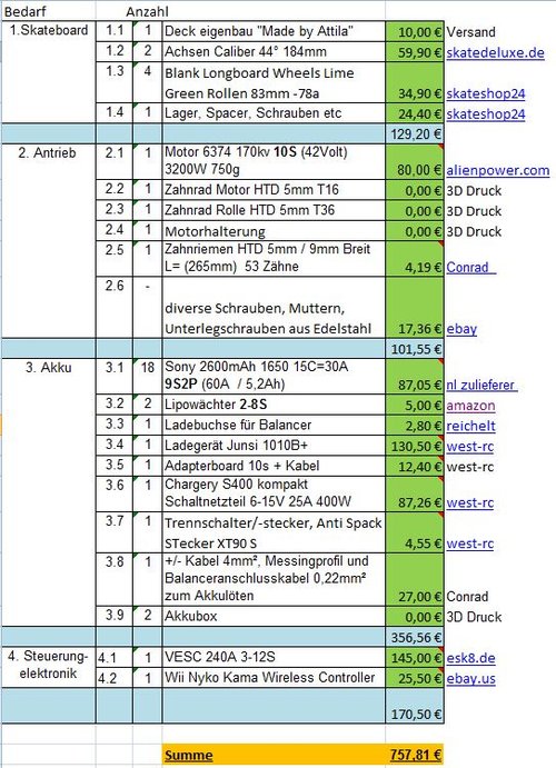 So da das Board erst mal fährt ein update zu meinem Setup der bestellten und verbauten Teile. https://drive.google.com/open?id=14qniwR239KV2foktAOXy5iOAtkT5HQQjZO8-UzHFpgE Summe ca. 760€ allerdings mit Ladetechnik ohne sind es 540€