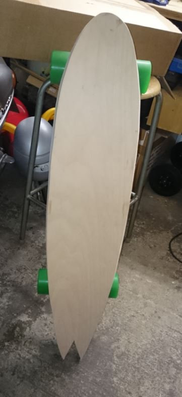 Weiter geht es mit dem Deck, welches mir Attila geschenkt hatte (danke noch mal). Das Brett hatte schon eine schöne Form, nur das Fishtail war nicht so meins, daher habe ich es abgesägt. Darauf folgten einige Stunden mit Schwingschleifer, Elektrohobel und Bandschleifer. Beim schleifen setzten sich P60 und P80 Schleifpapier durch. !!Achtung vor Elektrohobel, ich habe Ihn nur einmal kurz verkantet :devil: siehe Unterseite in der Nähe der Vorderachse! Nachdem ich mit der Form voll zufrieden war, habe ich das Brett drei Mal mit Leinölfirnis (speise Leinöl und Verdünnung, Verhältnis ca. 1:1) eingestrichen, nachgeschliffen, trocknen lassen und wieder gestrichen. Am liebsten hätte ich das Brett so gelassen, aber Gripp ist wichtig und die Idee von Attila mit Klarblick und Sand fand ich gut. Also habe ich seidenglänzenden Bootsklarlack (auf Verdünnungsbasis) gekauft. Seidenglänzend deshalb, da fast matt edler wirkt als eine Spiegelfläche, gerade auf Flächen wo man sich andauernd mit dreckigen Schuhen raufstellt. Verdünnungsbasis wegen der Verträglichkeit mit dem Firnis. Dann zwei oder drei schichten Klarlack streichen oder rollen und mit Sand vermischen und 3-4Tage aushärten lassen.