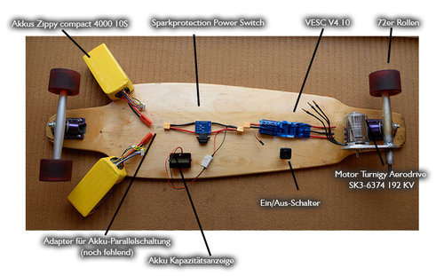 Danke für die Infos, das klärt einiges. Wir haben Akku-mäßig ordentlich aufgerüstet und hoffen mit zwei 10 S-Akkus auf mehr Leistung. Das Ritzel-Verhältnis gehen wir an, wenn die erste Testfahrt ansteht. Zu Attila: Leider sind wir mit dem Bau der Alu-Kiste schon angefangen, sonst hätten wir zugeschlagen. Allerdings haben wir eine Frage zum Aufladen der Akkus direkt am Board mit angeschlossenem VESC: Wo hast Du das Plus- und Minus-Kabel zum Aufladen angelötet? Der Parallel-Anschluß an den Akkus wäre ideal, oder? Die zweite Frage ist durch die 10S-Akkus entstanden, für die uns das passende Ladegerät fehlt. Unser Ladegerät schafft nur 6S-Akkus. Jetzt findet man Lösungen, bei denen die 10S-Akkus über den Balancer-Stecker mit zusätzlich angelötetem Plus- und Minuskabel auch an einem eigentlich zu kleinen Ladegerät geladen werden können. Wegen der geringen Kabelquerschnitte der Balancer-Stecker mit wesentlich geringeren Ladeströmen als bei einem für 10S ausgelegten Ladegerät. Was ist von solchen Lösungen zu halten? Im Anhang ist eine Verkabelungs-Übersicht unseres Longboards zu sehen. Besten Dank für die Hilfe Levin und Ted