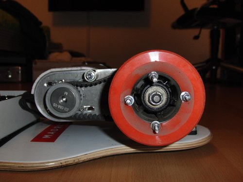 Leider ist am Anfang der Riemen beim starken Bremsen übergesprungen. Durch die Langlöcher konnte ich aber nicht viel mehr Spannung drauf geben. Habe mir kurzer Hand eine Anpressrolle improvisiert, tut was sie soll