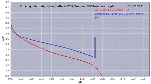 Zu den HE finde ich z.B.: http://www.mountainprophet.de/2016/05/24/akkukompass-in-fruhjahrsommer-2016/ "LG HE2 & HE4 sind solide Akkus, aber kaufen würde ich die nur, wenn sonst kein anderer Akku gerade verfügbar wäre." Der beste Vergleich einzelner Zellen findest du unter: http://lygte-info.dk/review/batteries2012/Common18650comparator.php Warum soll meine Grafik schlecht gewählt sein? Pulsentladung zeigt im Grunde nichts anderes auf nur dass die Erwärmung außer Acht gelassen werden kann weil die Zellen sich "erholen" können. Man kann aber eine konstante Entladekurve genauso nehmen und einfach die Erwärmung vernachlässigen und kommt beim gleichen raus