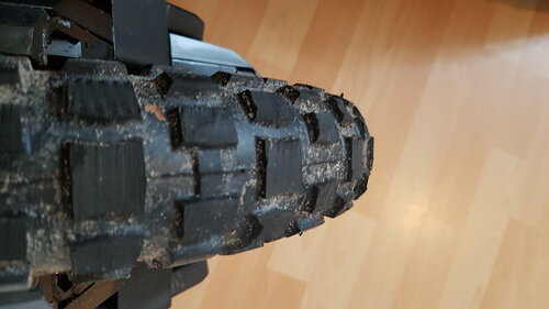 Hi, wie das so ist... "mit dem Kauf voll zufrieden" heißt ja nicht alles wäre perfekt. Mein Anwendungsgebiet ist ja in der Hauptsache abseits der Straßen, und da mir dort der CST C-186 sehr gut auf dem MSX gefiel dachte ich mir "gibts den auch in kleiner?". Nicht ganz, aber nah dran ist der Cheng Chin (CST - Cheng Chin Tires ?) C-183A. Den hatte ich via eBay dann einfach mal bestellt, und er kam heute an. Dimension 10-2.50 (auch wenn auf dem Originalreifen 14x2.5 steht, 10" Felge, 14" Außendurchmesser) Vorne und hinten, da wo der Reifen ins Gehäuse verschwindet musste ich 3mm Material wegnehmen; ansonsten passt er, sobald ordentlich auf der Felge ausgerichtet, problemlos. Freue mich schon auf die Probefahrt morgen. Zumindest indoor probiert habe ich ihn, alles Andreas ähem, scheuerfrei. Bin mal gespannt welcher Druck sich als gut rausstellt. Der Mantel ist deutlich steifer als der Originale, also sollte etwas weniger Druck auch ok sein. Ich fange mit 35psi an.