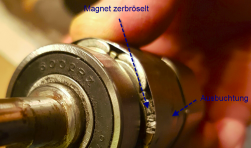 Danke für eure rasche Antwort. Ja, das hatten wir vor einer Woche über die DE Website gemacht aber keine Antwort erhalten. Die Kabel sind okay, aber die Spule hat eine Ausbuchtung und der eine Magnet ist zerbröselt. Ich habe es auf dem Foto eingezeichnet. Gibt es wohl gebrauchte Ersatzmotoren / Spulen oder einen ähnlichen Motor den wir einbauen könnten? Danke euch