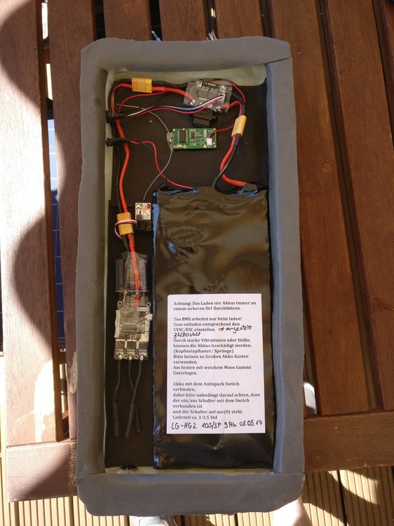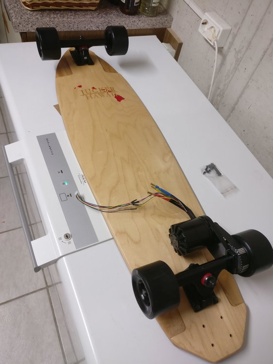 Moin zusammen, ich möchte meinen ersten Eigenbau gerne weitergeben (Infos gibts hier): ich hatte mit dem Ding bisher ne Menge spaß und es hat mich auch nach einigen KM nur einmal aufgrund eines defekten Empfängers im Stich gelassen. Wie bei den meisten anderen ist es nicht bei dem ersten Eigenbau geblieben und dennoch nutze ich aktuell fast nur noch mein kleines Lou board, weil es für meine Zwecke praktischer ist. (Macht aber nicht annähernd so viel Spaß..) Da das Board aber fast nur noch rumliegt möchte ich es lieber verkaufen damit es genutzt wird. Ein paar Eckdaten: - Jucker Hawaii deck - 6374 200Kv Motor - Caliber 2 Trucks - 83mm Wheels - 32/14 Übersetzung - 15mm Riemen - VESC 4.12 inkl., AntiSpark (Läuft auch im FOC mode wunderbar) - 10S3P 9Ah (HG2) Pack inkl. Anzeige - Eigenbau Gehäuse (nicht schön aber robust!) - Ladebuchse und Schalter im Gehäuse - Ladegerät (42V/4A) - GT2B im gedruckten Gehäuse - Geschwindigkeit: Mehr als 45Km/h - Reichweite: ca. 20-30km je nach Fahrstil. Das Ding hat wirklich enorme Power und schiebt meine 90KG jeden Hügel hoch! Das cruisen macht wirklich enorm viel Spaß mit dem Teil und auch bei höheren Geschwindigkeiten ist das Board sehr stabil. Das meiste wurde bei esk8.de gekauft! Meine Kosten: ca. 1000€ Meine Preisvorstellung liegt bei 800€ VB. Ich lege noch ein neue Gehäuse für die FB und einen Ersatzriemen mit dabei (von mir gedruckt)! Am liebsten wäre mir ein(e) Abholer(in)! Zu besichtigen im Gebiet Köln/Bonn. Bei Fragen einfach melden!