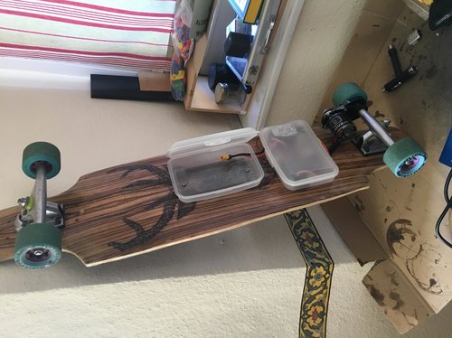 Da ich schon ein Board habe fallen die Kosten schon mal weg. Wenn alles gut klappt werde ich aber ein verbessertes Board aus Carbon und Glasfaser pressen (ähnlich Evolve GT Carbon Street).