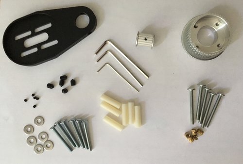 Der beiliegende Zahnriemen ist laut Aufschrift 225mm lang und scheint nicht besonders flexibel. In meinem Set waren ausreichend Schrauben, Beilagscheiben für M4, Imbus-Schlüssel und Kunststoff-Abstandhalter für M4 (25mm lang) dabei.