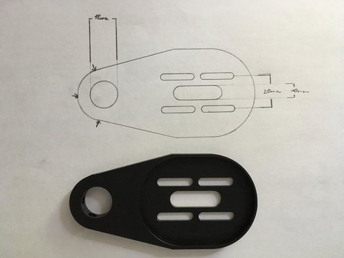 Sie ist aus 9mm starkem Metall gefertigt, für den Motor sind auf einer Seite 6mm starke Vertiefung mit 52 x 69mm und entsprechender Rundung ausgefräst. Dies finde ich ganz gut, damit reduziert sich die Gesamtbreite mit Motor. Die Ausschnitte zur Befestigung des Motors sind knapp 5mm breit und liegen 20mm (Mitte zu Mitte) auseinander. Der Ausschnitt für die Achse ist 10mm. Damit ist die Halterung lediglich für 50mm-Motoren mit 8mm-Achse und einem Schrauben-Abstand von ca. 20mm geeignet. Der Motor kann um ca. 20mm verstellt werden, mittig ist der Abstand zur Longboard-Achse 60mm.