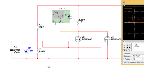 Hi, warum Entschuldigung? Die Ursprungsfrage war ein Antispark und nicht Soft on/off! Anbei eine kleine Simulation. VG Barney Interpretation des Ergebnis: nach ca. 160ms wird innerhalb von 20ms der/die MOSFETs (soft) durchgesteuert.