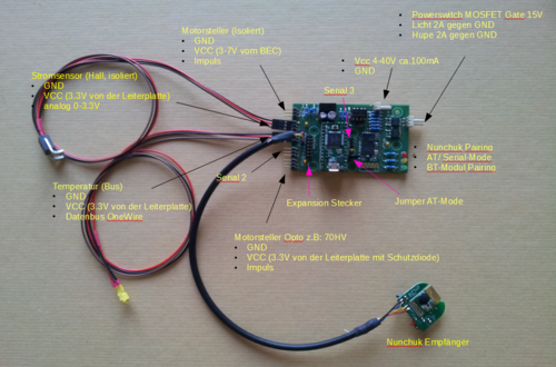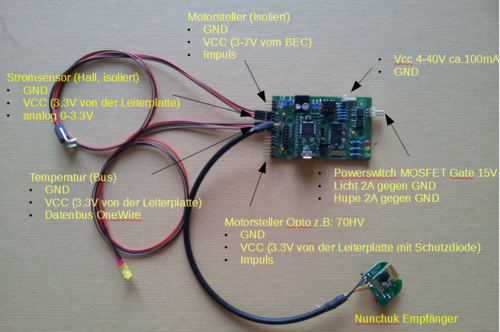 Hi nambatu, ich vermute der Begriff Fernbedienung ist hier falsch. Weiter vermute ich, dass du nicht zwei Achsen benötigst. Willst du ein ein Energiepedal verwenden, oder mit der Hand die Motorleistung vorgeben? Wie auch immer, die Demos des Arduino haben deine Anforderung schon drin. Da musst du nur wenig anpassen. Wenn dir hier ein µ-Kontroller als übertrieben erscheint, kommt von mir der Hinweis, dass du dann aber später die Möglichkeit hast verschiedene Luxus-Funktionen unterzubringen. 1. Strombegrenzung 2. Geschwindigkeitsbegrenzung 3. Geschwindigkeitsmessung (Tacho) 4. Verschiedene Kurvenformen für das Energiepedal 5. Statusanzeige mit Display, für Spannung, Strom, Energie, Temperatur usw.. Was halt dir als wichtig erscheint. 6. Telemetrie (du lässt dir die aktuellen Daten aus 5 aufs Handy per BT-Modul zusenden) 7. Anomaliendetektor (Um Störungen im Raum Zeit Gefüge rechtzeitig ausweichen zu können. Ich habe schon mal davon gehört und diejenigen, die eine Seifenkiste ohne solch einen Detektor gebaut haben, konnten später davon nicht mehr berichten, weil sie sich momentan in der Unwahrscheinlichkeit befinden.) VG Barney