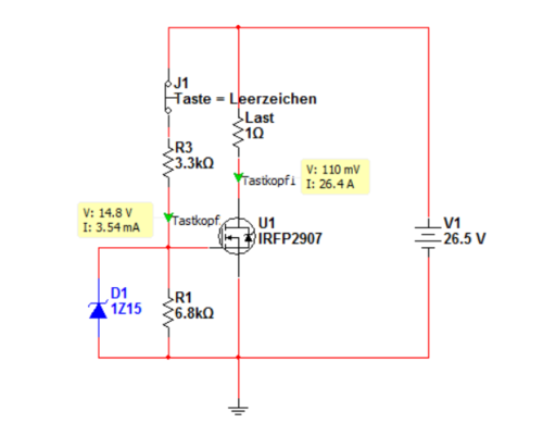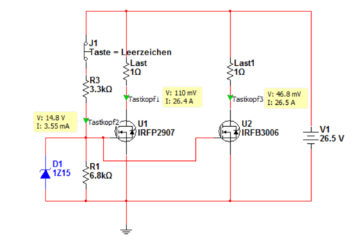 2 x IRFB 3006 :: Leistungs-MOSFET N-Ch TO-220AB 60V 195A 2,80€ -> 5,60€ (Es würde auch einer reichen!) (Reichelt) 1 x 3.3k Ohm Widerstand Metallfilm 1%, 0.6W, Bauform 207, 0,05€ (Segor) 1 x 6.8k Ohm Widerstand Metallfilm 1%, 0.6W, Bauform 207, 0,05€ (Segor) 1 x ZD 15V (Z-DIODE 15V) 1.3W 0,15€ (Segor) 1 x Wippenschalter 1,50€ (Segor) 2 x Kühlkörper für die IRFB z.B. V FI353 :: Aufsteckkühlkörper, 25,4x25,0x8,3mm, 18K/W 1,14€ (Reichelt) Die Teile bekommst du auch bei Unrad. VG Barney P.S: Das Datenblatt des MOSFETs bekommst du über google.de. Da wo Last steht, kommt dein Motorregler und der Empfänger hin. Ich habe zum Vergleich zwei verschiedene MOSFETs betrachtet, es reicht aber ein IRFB3006. Wenn du zwei nimmst, bist du auf der sicheren Seite. Es wäre besser, wenn du den Aufbauplan zeichnest und Beatbuzzer und oder ich schauen drauf, ob du es richtig verstanden hast. Ganz wichtig: Da hier die Masse geschaltet wird, darf es keine Komponente geben, die direkt an Masse (GND, oder -) hängt!!!:devil: