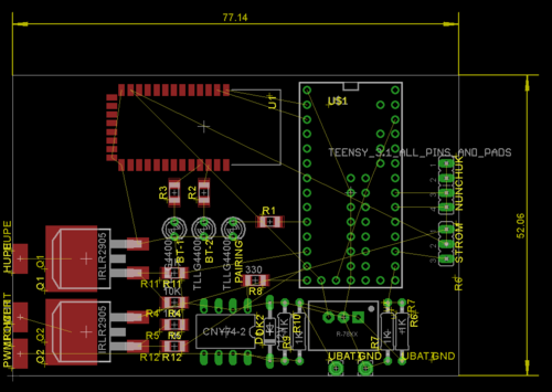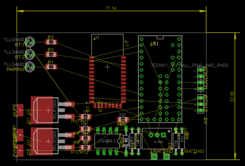 Hi Dude, hat länger gedauert, da mich Eagle verärgert hat und die Berliner SkatebyNight zu verlockend war. Ich muss noch die Bauteilgröße testen und die Raster, dann kann das Layouten (Routen) beginnen. Eine Leiterplatte soll laut Rechner 12,-€ /Stück bei 5 Stück + Porto * MwSt kosten. VG Barney Elektroskate Teensy.zip