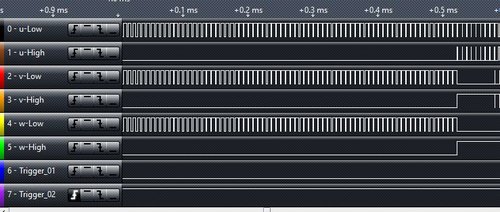 Was fürs Auge. Einmal der Übergang von der Fahrt in den Bremsmodus (Trigger_02). Danach der Übergang von der Bremse in das Fahrmuster. Jetzt noch die inverse Clarke-Transformation verstehen .... Mal sehen.... Ich finde die Bilder erklären sich selbst