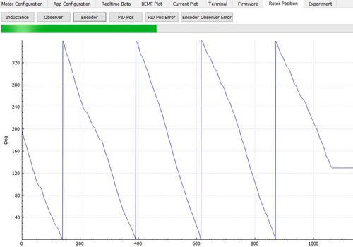 Alles was zum Anfang schön klingt, hat eine Fußangel: Der Sensor hat eine spezifizierte Abweichung von 1°. Derzeit kommt man viel liebe auf 2° Einstellgenauigkeit. Die 1° beziehen sich auf die Nichtlinearität es magnetischen Messsensors. Der Sensor ist aber auf 0.1X° in der Wiederholung genau. Durch die 7Poligkeit muss man den Fehler mal 7 nehmen, was bei 2° folglich 14° bedeutet. Benjamin hat eine sinusförmige Abweichung zwischen dem Observer und dem AS5047p festgestellt, so dass er wie bei den Hall-Sensoren, den AS5047P nur bis zu einer bestimmten Geschwindigkeit heranzieht. Er hat aber vor, den AS5047P durch Messungen zu Linearisieren.