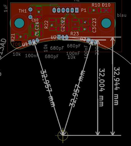 Jetzt habe ich es mit deiner dxf-Datei es hinbekommen. Die Sensoren sollten jetzt bis auf 1mil stimmen. Die Pads müssen einen Minestabstand zum Platinenrand haben. daher bin stehen die Bauteile nicht im Kreis. Ich habe einen Hilfskreis für die saubere Platzierung eingezeichnet und in der Entfernung zur Motormitte sauber ausgerichtet. Dann nur noch ca. 30 Zeilen versteckten Text und Parameter aus der dxf-Datei entfernen und gut ist. Die Haltelöcher sind auch um wenige mil verschoben und auf deine Maße angepasst.