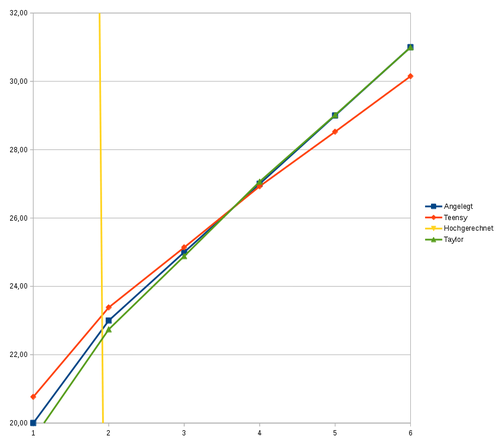 3. Mann muss nicht immer in die Ferne schweifen.... Mit Libre Office oder Excel (nur bis zur 3 Ordnung) kann man die Polynome bestimmen. Leider Rundet Excel zu früh, so das Polynome > 3 Ordnung nur Schrott sind. Es war zu trivial: Die beiden Achsen angelegt und Teensy in ein XY-Diagagram anzeigen lassen. Die Teensy-Werte sind die X-Achse. Dann eine Trendlinie in den Graphen einzeichnen lassen. Hier Linear oder Poly auswählen. Die Formel dazu anzeigen lassen und in die Tabelle kopieren. x durch *B2^ ersetzen und das wars. Bis auf +- 10mV genau. Teensy Linearität 22.04.2015.zip