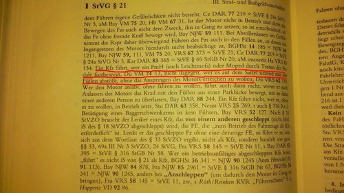 19. Das bestreitet ja auch niemand ;o) Es ging nur darum ob es mit ausgeschaltetem Motor ein Führen des selbigen ist. Denn wenn es das nicht ist wie oben im Paragraphen entfalle nämlich die Straftat des führens eines Kfz im öffentlichen Straßenverkehr (gut wenn man nicht in Besitz einer Fahrerlaubniss ist) und es bliebe in Anführungsstrichen nur noch das Vergehen einer nicht Versicherung des Boards im geschobenem Zustand. Mal noch ein Auszug vom OLG 364). Auch das Oberlandesgericht Düsseldorf hat danach differenziert, ob ein Mofa mit Motorkraft oder nur im Pedalbetrieb gefahren wird, und will offenbar für den zweiten Fall davon ausgehen, dass das Mofa im Pedalbetrieb kein Kraftfahrzeug i.S.v. § 24 a StVG darstellt, jedenfalls nicht als Kraftfahrzeug geführt wird, so dass deshalb eine Ahndung nach § 24 a STVG ausscheidet (OLG Düsseldorf VRS 62, 193, 195; VM 1975, 20).