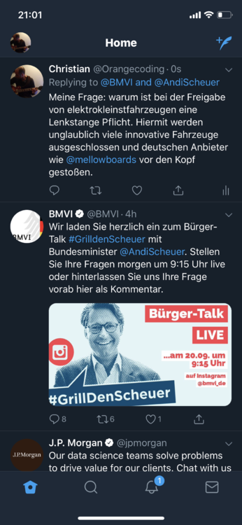 "Grillt" den Scheuerweakmap hat ein Thema erstellt in: Rechtliches (Straßenverkehr, Versicherungen, eKFV) Siehe Bild im Anhang. Der Scheuer lädt zu einem "Bürgertalk" ein. Dass ist eure Chance zu sagen dass euch das Thema Elektroboards wichtig ist!
