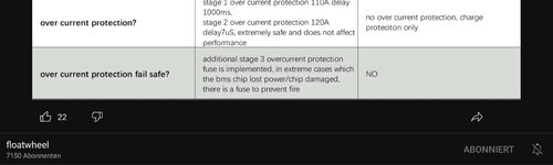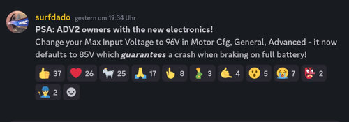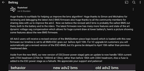Moin! Es gibt leider einige unschöne Begleiterscheinungen zur Markteinführung des Floatwheel ADV 2, die ich gerne in diesem gesonderten Artikel besprechen/zusammenfassen möchte. Dies bedeutet: die klassischen Reviews des ADV 2 werden weiterhin in der Rubrik 'Produktbesprechungen' zu finden sein. Technische Diskussionen, Identifikation von Problemen und Vorschläge zur Lösung dieser Probleme werdet Ihr wiederum in dieser Rubrik 'Eigenbau' finden. Der Grund ist folgender: so sehr sich die Community auch wünscht, dass das Floatwheel ADV (wie auch das Fungineers X7) eine Möglichkeit darstellen möge, ein VESC-Board fertig aus dem Karton zu nehmen und damit wunschlos glücklich zu sein, so verdeutlichen die Startprobleme des ADV 2 nun, dass es sich immer noch um ein sensibles Produkt handelt, bei dem der Endverbraucher - also im Zweifel Ihr - gut beraten ist, sich auf dem Laufenden über Einstellungen, Sicherheitsvorkehrungen usw. zu halten. Nun muss man generell sagen, dass auch die Produkte aus dem Hause Future Motion in der Vergangenheit unangenehm auffielen, wenn sie z.b. durch Ghosten (Onewheel GT), geklemmte Kabel (Onewheel Pint X) oder abruptes Deaktivieren (Onewheel GT S-Series) auffielen. Der Unterschied bei diesen letztlich als Produktfehler zu bezeichnenden Phänomenen ist folgender: Future Motion hat sich oft genug sehr viel Zeit gelassen, Fehler zuzugeben und abzustellen, musste teilweise sogar zu Rückrufen gezwungen werden. Die Lösung hieß dann immer: schick Dein Board in unser Hauptquartier nach Kalifornien. Im Falle des Floatwheel ADV 1 und 2 durften wir andere Reaktionen von Tony (dem Kopf hinter Floatwheel) erleben. Er gab Fehler zeitnah zu, bot Lösungen an und schickte den betroffenen Kunden in sehr vielen Fällen kostenlosen Ersatz nach Hause. In einer perfekten Welt gäbe es keinerlei Probleme mit einrädrigen, selbstbalancierenden Fahrzeugen, leider leben wir aber in keiner perfekten Welt. Aktuell scheint die VESC-Community etwas über Kreuz mit Tony zu liegen, was das korrekte Vorgehen, die optimalen technischen Lösungen usw. angeht. Surfdado wendet sich regelmäßig per Videos an Tony und die Nutzer, während Tony vermutlich derart mit der Kundenversorgung beschäftigt ist, dass von ihm schon seit Längerem keine Videos mehr erschienen sind. Hier also der Versuch, Euch chronologisch geordnet über Probleme und Lösungen zum ADV 2 auf dem Laufenden zu halten - selbstverständlich nach bestem Wissen und Gewissen, aber ohne Anspruch auf Vollständigkeit. Ich hoffe, dass die Beschäftigung mit allen Aspekten der Produkte Euch dann hilft, eine fundierte Entscheidung für Euch selbst zu treffen. Transparenz sollte der Schlüssel dazu sein. Hinweis: Dieser Artikel wird fortlaufend angepasst. Nordlicht ---------------------------- Surfdados Bemerkungen zu fehlerhaften Einstellungen ab Werk (30.1.2025): Surfdados wichtige Hinweise für Kunden des ADV 2 (13. Februar 2025): Surfdados Ansprache an Tony zu den korrekten Limitierungen der Einstellungen (13. Februar 2025): Reddit-Diskussion zur Sicherheit von VESC-Boards (24.2.2025) https://www.reddit.com/r/onewheel/comments/1ix69nx/adv2_fire_should_we_stop_recommending_vesc_to_the/ Reddit-Bericht und Diskussion zum Brand eines Floatwheel ADV 2 (25.2.2025): https://www.reddit.com/r/FloatwheelTeam/comments/1iy8b8c/im_the_guy_with_the_flaming_hot_floatwheel_an/?rdt=53312 Surfdados Vorschläge zu den korrekten Einstellungen des BMS (1.3.2025) ------------------------ Tony's Video zum Austausch von Batterie, BMS und Controller (2.3.2025): Tony's Video zum Austausch der Bluetooth-Antenne (3.3.2025): --------------------- Offenbar kann Tony Surfdados Kritik an den Algorithmen des BMS nachvollziehen. Tony hatte wohl einen Auftrag an eine chinesischen Drittanbieter vergeben, dessen Arbeit letzten Endes aber Mängel aufwies. Nun überarbeitet Surfdado das ganze in seiner Freizeit, hier symbolisch dargestellt: Was bedeutet dies nun für alle bisher ausgelieferten BMS mit dem fehlerhaften Logarithmus? Tonys Antwort: -------------------------- Sodele, offensichtlich ist die Überarbeitung des BMS und der zielführenden Werte abgeschlossen - hier Tonys Vorher/Nachher-Vergleich: ---------------------- Nachdem nun die neuen Elektronik-Komponenten die ersten Besitzer von ADV 2 Boards erreicht haben, trat ein ungewöhnliches Problem auf. Ein Drop von einem kleinen Kantstein führte bei manchen zum Abschalten des Boards, Grund war offenbar eine entstehende Überspannung. Daher Surfdados Sicherheitshinweis aus dem Floatwheel-Discord Channel: ---------------------- Das Muster 'Tony macht nen Fehler, aber die Community passt auf...' hat sich einmal mehr wiederholt. Hier die korrigierten und derzeit allerseits als KORREKT befundenen Sicherheitshinweise für alle, die die neuen Elektronik-Komponenten (ESC und BMS) erhalten haben Stand 23.5.2025): Nordlicht