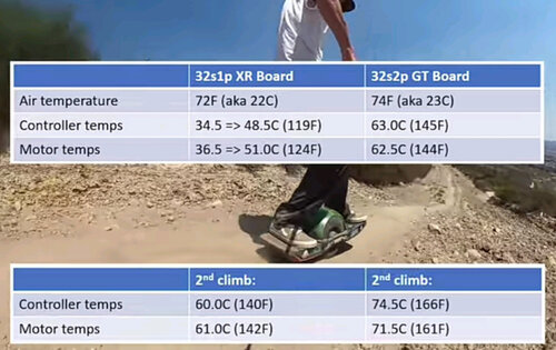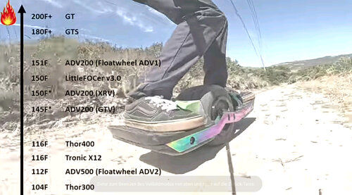 Moin! Surfdado wird einfach nicht müde, weitere Videos rauszuhauen... Ich sehe mich gezwungen, einen ganz neuen Artikel zu verfassen, da der große Vergleich an Surfdados Folterhügel (in dieser Rubrik 'Eigenbau' begonnen am 29. August 2024) von mir dermaßen mit Videos und Grafiken vollgestopft wurde, dass das Forum sich beharrlich weigert, noch weitere Datenmengen hinzuzufügen... Macht aber nix, denn in diesem Vergleich zwischen ADV 1 und ADV 2 probiert Surfdado, eine noch extremere Stelle seines Folterhügels mit sage und schreibe 60% Steigung zu erklimmen, an der er in der Vergangenheit mit allen möglichen Boards gescheitert war. Streng genommen ist dies also der Beginn einer neuen Testreihe - ich gehe davon aus, dass künftig HIER die entscheidenden Tests mit leistungsstarken Boards stattfinden werden. Zum Glück fügt Surfdado auch wieder seine Ergebnis-Grafik bei. Lasst Euch nicht verwirren, er startet den Test im Video mit dem ADV 2 (in blau) und testet danach dann das ADV 1 (in rot). Die Geräusche der Drohne, welche von Surfdados Sohn pilotiert wird, machen das Video akustisch in etwa so angenehm wie eine Wurzelbehandlung beim Zahnarzt aus 'Little Shop Of Horrors'... Viel Spaß dabei 😬! --------------------------- Surfdado legt abermals nach, hier der Thor 400 Controller: Sogar schicke Grafiken hat er in petto... Vergleich der bisher getesteten Controller: Ergo: Die Geräte werden stetig resistenter gegen Überhitzen. Knorke! ----------------------------- Moin nochmal! Surfdado war in der Vergangenheit einer der größten Kritiker der Idee, den Controller eines VESC-OneWheels in die Achse eines Cannoncore-Motors aus dem Hause Floatwheel zu verbauen. Er war sicher, dass eine derartige Konstruktion ganz sicher zum Überhitzen des Systems führen müsste. In diesem Video überzeugt er sich selbst vom Gegenteil und leistet Abbitte... Hier seine zugehörigen Grafiken als Screenshot: Offenbar folgt schon bald ein Video, in dem das neue Future Motion Flaggschiff den Hügel raufgejagt wird. Wobei die erreichten Temperaturen offenbar deutlich höher liegen, als dem Besitzer lieb sein dürfte. To be continued... Nordlicht