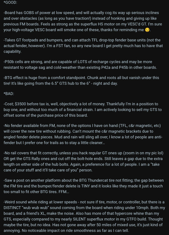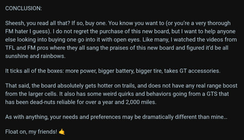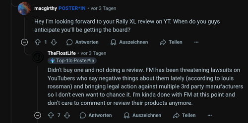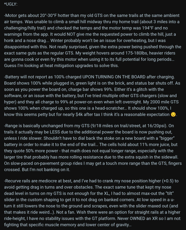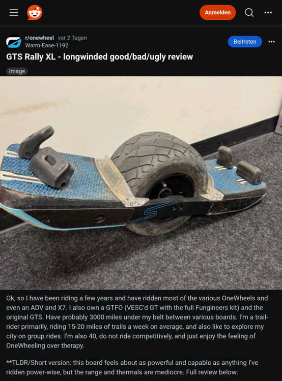 Moin! Ich habe leider noch keine klassische Produktbesprechung für Euch parat, aber ich dachte mir, ich sollte dennoch offiziell verkünden, dass Future Motion ein neues 'Flagship Model' auf den Markt gebracht hat, nämlich das... es heißt wirklich so... Future Motion Onewheel GT S-Series Rally XL !!! Ich habe dieses neue Modell bereits vor Tagen, also wenige Stunden nach offizieller Bekanntgabe durch den Hersteller, in die Marktübersicht eingefügt - da könnt Ihr gerne alle technischen Details erfahren. https://www.elektro-skateboard.de/topic/6789-onewheel-marktübersicht-einrädriger-selbstbalancierender-skateboards-in-alphabetischer-reihenfolge-weitere-modelle-willkommen/ Worin unterscheidet sich nun dieses brandneue Modell vom bisherigen Spitzenprodukt aus dem Hause Future Motion, dem Onewheel GT S-Series? Es hat erstens einen mit 12 Zoll nun größeren Reifen auf einer 6-Zoll-Felge, zweitens entsprechend verlängerte Rails, die dem Reifen den nötigen Platz verschaffen und drittens einen abermals überarbeiteten Motor, der noch mehr Power als bisher liefern soll. Dieses Modell - in der Kurzform Rally XL genannt - soll künftig das Produkt darstellen, das bei Rennen wie z.b. dem Race For The Rail eingesetzt wird. Unklar ist jedoch, ob es schon beim diesjährigen Rennen zum Einsatz kommen wird, denn das hieße ja mal, dass beispielsweise Mercedes und Austen Silva, die angeben, maßgeblich an der Entwicklung beteiligt gewesen zu sein, einen ganz erheblichen Trainingsvorsprung mit dem Rally XL hätten, der an Wettbewerbsverzerrung grenzen dürfte. Wie dem auch sei: es gibt eine Menge 'Reviews / Werbung' aus dem Hause Future Motion selbst, aber keinerlei erkennbare Bestrebungen von bekannten YouTubern, das Produkt zu besprechen. Üblicherweise würde ich darauf warten, dass z.b. The Float Life (die bisher IMMER zu den allerersten Kunden gehörten) ihr Exemplar erhalten und ein Ruck-Zuck-Video mit ersten Eindrücken veröffentlichen. Nur das wird wohl nicht passieren, siehe folgenden Reddit-Text von Jeff McCosker: Quelle: https://www.reddit.com/r/onewheel/comments/1mkmae6/how_come_the_gts_and_rally_xl_dont_have_cold/?sort=old Die Rechtsabteilung von Future Motion scheint ihrer gewohnt forschen Gangart treu zu bleiben. Wer am Rande mitbekommen hat, dass the Float Life als Nebenprojekt ein sogenanntes 'Wheelie Fun Bike' herausbringen wird (nicht mein Thema, deshalb nix weiter dazu), in dessen Video einige der üblichen verdächtigen YouTuber zu sehen sind, wie sie das Bike fortbewegen, der kann sich denn wohl auch an einer Hand abzählen, dass diese besagten YouTuber wohl kaum ein Gratisexemplar von Future Motion zugesandt bekommen werden. Ich kann mir auch nur schwer vorstellen, dass die Content Kreatoren gewillt sein werden, den regulären Kaufpreis von 3500$ dafür auszugeben, um am Ende vielleicht noch juristische Scherereien mit Future Motion am Hals zu haben. Also: googelt gerne das Produkt und seht Euch die Hochglanzpräsentation des Herstellers an. Sollte es wider Erwarten bald Reviews von unabhängigen Testern geben, dann reiche ich diese hier nach. -------------------- Reichweitentest von Mario Contino: ------------------------------- Die Review eines Reddit-Nutzers - ich habe sie in Form von vier Screenshots eingefügt. Sorry, die Formate sind etwas krude geraten... ---------------------------------- Und schließlich doch noch eine Review, ein Vergleich mit VESC, Autor: Surfdado. -------------------------------- Und dann noch ein Vergleich des GT S-Series Rally XL mit einem Pint X, bei dem allerdings ein Pint V-Kit von Floatwheel eingebaut wurde - das Pint X läuft nun also mit VESC: --------------------------- Jimmy Chang's Kanal 'Freshly Charged': Nordlicht