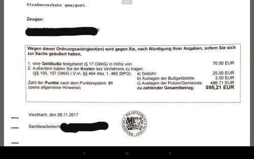 Das Glück des TÜV-Testverfahrens kann allerdings ein trügerisches sein. Ich meine, dass diese Rechnung hier aus diesem Forum stammt, ist schon ne Weile her. Am Ende betrug das eigentliche Bußgeld für Fahren eines nicht zugelassenen Kraftfahrzeugs zwar nur 70€ plus Bearbeitungskosten... aber die technische Überprüfung durch die Herren Experten wird natürlich DIR in Rechnung gestellt. 'Alles in Ordnung, Herr Elektroskater, Ihr Gerät entspricht den Vorschriften. Das macht dann 496 Euro und 71 Cent. Möchten Sie bar oder mit Karte zahlen? ' Stichwort: Wir sitzen am längeren Hebel... Man kann nur hoffen, dass mit Einrichtung der Ausnahmeverordnung solche Schikane als unverhältnismäßig angesehen würde. „Vor Gericht und auf hoher See“ so heißt es im Volksmund. Nordlicht