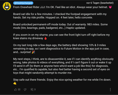 Moin! Leider passiert es nicht zum ersten Mal (wir erinnern uns an das ghostende Onewheel GT, geknickte Kabel im Onewheel Pint X, schiefgelaufene Firmware-Updates usw. - viele dieser Probleme sind in vorherigen Beiträgen ☝️ bereits beschrieben worden), dass Kritik an Future Motions Reaktion auf Fehlfunktionen ihrer Produkte laut wird. Justin von FixMyPev hat sich in der Vergangenheit schon mehrfach als streitbar gezeigt, und ein Blick in die Kommentare seiner Youtube-Videos zeugt davon, dass viele Mitglieder der Community seine Kritik an Future Motion teilen. Das aktuelle Thema betrifft nun das Flaggschiff von Future Motion, das Onewheel GT-S. Offenbar sind bereits mehrere Fahrer durch Fehlfunktionen des Boards gestürzt und dabei auch ernsthaft verletzt worden. Ursache sollen die wohl zu wenig leistungsstark gewählten Mosfets im Controller sein. Justin spricht in diesem Zusammenhang von "negligence" - also von Fahrlässigkeit. Ich hoffe für ihn, dass er einen guten Rechtsbeistand hinter sich weiß... Ich besitze selbst kein Future Motion Board (geschweige denn ein GT S-Series) und kann daher nur versuchen, die Diskussion so abzubilden wie sie sich mir nach Netzrecherche darstellt. Ich denke, dass es kein Zufall ist, dass ich vor einer Woche dieses Video hier fand: Dieses Video wurde zwar nur etwa 50 mal aufgerufen und hat bisher keinen einzigen Kommentar ... Es hat mich aber veranlasst, das originale Floatwheel-Video zu recherchieren, welches ich damals in der Rubrik 'Eigenbau' postete. Um Euch lästige Sucherei zu ersparen, hätten wir hier den Link zu Tony's Analyse der GT S-Series mit dem Veröffentlichungsdatum vom 18.12.2023, der obige Ausschnitt stammt von Minute 7:50. Laut Tony's damaliger Analyse sind die bis 120 Volt belastbaren Mosfets für das 113 Volt GT S-Series in Anbetracht ihrer absolut zentralen Bedeutung für die Sicherheit des Boards unterdimensioniert gewählt. Daher kommt er zu folgender Prognose, die sich nach neun Monaten leider zu bestätigen scheint: "Ich glaube, dass es eine hohe Defektrate geben wird". Eine unnötig hohe Defektrate bei einem derart schnellen selbstbalancierenden Board ... das kann für die Fahrer sehr übel enden. --- Wenn Ihr eine Meinung zu der Thematik oder sogar praktische Erfahrungen habt, lasst gerne von Euch hören! ---------------- Nachtrag: eine von mehreren Diskussionen zum Thema auf Reddit https://www.reddit.com/r/onewheel/comments/1fd5wv6/gts_failures/ ----------------- Die Meinung eines Elektroniknerds, der offensichtlich aus einer OneWheel-fernen Branche kommt und deshalb wohl keine Angst vor wirtschaftlichen Nachteilen haben muss: Nordlicht- 30 Antworten