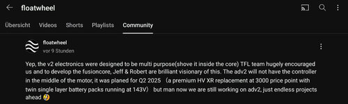 Moin! Ich habe endlich etwas Zeit und Muße um das neueste Video von Tony einzustellen: Vermutlich waren Future Motions Veröffentlichungen zu den neuen Untervarianten des Onewheel GT S-Series (Recurve Rail und Rally Edition) der konkrete Auslöser, den Fortschritt aller verschiedenen Entwicklungen gerade JETZT zu veröffentlichen. Vorneweg: der Floatwheel YouTube-Kanal wird in einigen Tagen wohl abgeschaltet, vermutlich auf rechtlichen Druck durch Future Motion hin. Viele Videos sind seit längerem schon nicht mehr in den USA zu sehen gewesen, und ich gehe davon aus, dass Tony eine alternative Plattform nutzen wird, um Videos zu posten. Dies dürfte auch bedeuten, dass die Links in meinen älteren Beiträgen bald nicht mehr funktionieren werden - wenn möglich versuche ich die Inhalte von der alternativen Plattform neu zu verlinken, damit die älteren Beiträge weiterhin ihren Dienst tun. Doch nun zum aktuellsten Stand: Wie bereits für das Onewheel GT geschehen wird es bald Kits für Pint, Pint X und XR geben, die es dem Besitzer ermöglichen, das Board auf VESC umzurüsten. Das jeweilige Kit wird sowohl einen Controller als auch ein Charge-Only-BMS enthalten. Tony erklärt die Schwierigkeiten technisch sehr detailliert, so sind teilweise Stecker neu zu designen, um in den bestehenden Boards mit dem begrenzten Platz auszukommen. Auch das GT S-Series soll langfristig ein derartiges Umbau-Kit erhalten, sobald der entsprechende Controller fertig ist. --------------------- Und nun zu Tonys kompletter Eigenentwicklung, dem ADV 2: Während der neue Controller bereits zufriedenstellend funktioniert, macht das neue BMS Probleme. Es handelt sich dabei um ein Smart BMS, das ständig mit dem Controller kommunizieren soll und somit bei Problemen einen kontrollierten Pushback erzeugt, damit der Fahrer in allen Lebenslagen sicher bleibt. Auch die Gesundheit jeder einzelnen Zelle wäre mit diesem Teil bequem zu überprüfen. Aufgrund der großen Leistungsfähigkeit dieses ADV 2-BMS (es soll bis zu 160 Volt Akkuspannung unterstützen, was ziemlich genau der doppelten Spannung des bisherigen ADV entspricht) gibt es aktuell noch Probleme mit überhitzenden Bauteilen. Tony ist aber optimistisch, diese in den Griff zu bekommen - dann wären die 113 Volt eines GT S-Series keinerlei Problem für dieses BMS der 2. Generation und auch etwaige Entwicklungssprünge in der Zukunft könnten mit diesem Neuland betretenden BMS realisiert werden. Ach so: ein Upgrade-Kit von ADV 1 auf ADV 2 ist weiterhin geplant. Man darf gespannt sein, ich versuche, Euch auf dem Laufenden zu halten. --------------------- Update! Ab jetzt ist das PintV-Kit vorzubestellen, Details dazu auf der NEUEN Domain, die nicht mehr .ru für Russland, sondern stattdessen .co für Kolumbien nutzt: https://floatwheel.co/ ------------------- Hier der aller neueste Stand: ------------------- Zum Thema ADV 2 muss gesagt sein, dass das BMS von Grund auf neu designt wird, entsprechend verzögert sich das Erscheinungsdatum weiter: Nordlicht