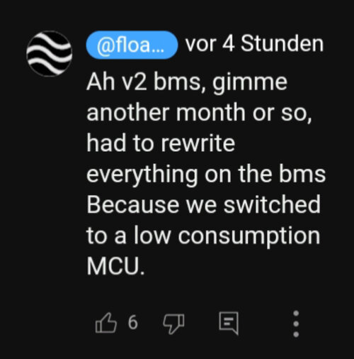 Moin! Abermals spektakuläre Neuigkeiten von Stanley / VOW-Systems aus Australien: Der Mann hat eine Fülle von neuen Produkten am Start, die in Kombination ermöglichen könnten, das Onewheel zu revolutionieren. Vermutlich arbeitet auch Tony von Floatwheel bereits seit längerem an einer derartigen Umsetzung - aber Stanley hat die Konstruktion scheinbar als Erster zum Funktionieren gebracht... Er stellt sie in seinem Video zumindest als Erster öffentlich vor. Das Highlight sieht aus wie folgt: Die großkalibrige hohle Achse des Floatwheel-Cannoncore-Motors wird dazu genutzt, den VESC-Controller im Inneren aufzunehmen, während die Vorderseite und die Rückseite des Boards jeweils symmetrische Boxen mit massiven Akkus beheimaten. Stanley spricht von 16 doppelreihigen Akkuzellen vorn und 16 doppelreihigen Akkuzellen hinten, also summa summarum von einem Akku mit 32S2P bestehend aus Molicel P45B Zellen. Das Ergebnis wäre eine Ladeschluss-Spannung von heftigen 134,4 Volt und ein gewichtstechnisch perfekt ausbalanciertes Board! Ebenso bemerkenswert seine Antwort auf die Empfehlung von Mitgliedern der Community, sich die Erfindung bloß patentieren zu lassen, Zitat: Future Motion - falls ihr zuhört (und ich hoffe ihr tut's) - Bitte kopiert mich! (...) Ich will einfach GUTE BOARDS. Stanley's Meinung nach ist dieses symmetrische Board mit all seinen Herausforderungen so schwierig als Eigenbau / DIY-Projekt zu realisieren, dass es Future Motion und/oder Floatwheel als professionelle Hersteller brauche, um es für Jede und Jeden erhältlich zu machen. Um diese Herausforderung zu meistern, bietet er zu guter Letzt auch noch seine Unterstützung bei der Realisierung an. Ebenso viel Stil zeigt Stanley dadurch, dass er herausstellt, wie viel Vorarbeit die Community bereits geleistet hat, um dies symmetrische Board überhaupt möglich zu machen. Aber seht selbst... --------------------- Nachtrag: ein Blick in den Community-Bereich des Floatwheel YouTube-Kanals ergab die Bestätigung, dass auch Tony bereits an dem Thema dran ist - allerdings für einen legitimen XR-Nachfolger mit 34S1P-Akku und 143 Volt Ladeschluss-Spannung. Weia! Noch nachträglichere Anmerkung: Dieser Post war Tony (oder Jeff & Robert...?) vielleicht am Ende doch zu offenherzig, jedenfalls wurde er mittlerweile gelöscht. Wohl dem, der rechtzeitig einen Screenshot davon gemacht hat... 🤫 ------------------------- Hoppla, da war Stanley wohl etwas sehr optimistisch mit dem Gelingen seines revolutionären Vorhabens... Der Teufel steckt halt im Detail, es ist noch kein Meister vom Himmel gefallen, 5 Euro in's Phrasenschwein. Version 1 hatte massive Designfehler, Version 2 soll diese beheben, sie befindet sich aber noch in der Testphase. Hier der aktuelle Stand: Nordlicht