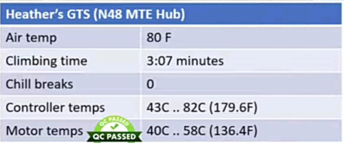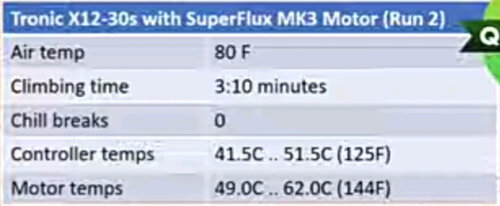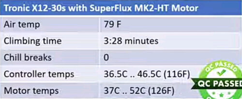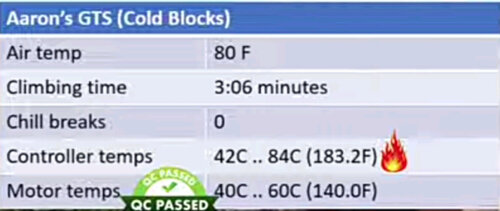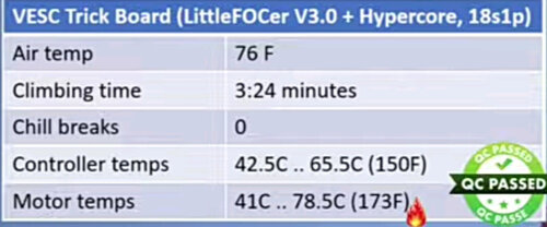 Moin! Ich versuche mich mal daran, die viele Arbeit, die Surfdado mit diesen Videos geleistet hat (zum wiederholten Male und wie immer zum Wohle der Community) für Euch zusammenzustellen und mit ein paar Serviceleistungen (wie etwa Umrechnungen) zu versehen. Alle weiteren Details, die Ihr wissen wollt, entnehmt Ihr bitte direkt aus den Videos - Surfdado gibt zum Beispiel viele mündliche Erklärungen ab, die ich unmöglich komplett verschriftlichen kann. Er hat es sich in diesem Fall zur Aufgabe gemacht, die unterschiedlichen erhältlichen Optionen an Motoren und Controllern auf ihre Leistung und Resistenz gegen Überhitzen zu prüfen. Vielleicht werdet Ihr selbst nie in solch extreme Bereiche vordringen, es ist trotzdem sehr interessant zu verfolgen, wie sich die einzelnen Boards schlagen. Welches verbaute Teil mag letztlich das "schwächste Glied in der Kette" sein? Also: Im Sinne der Wissenschaft ... Hillclimb Challenge! Hier zunächst die furchteinflößenden Details seines Killer-Hügels, der San Clemente "Ski Slope" (also "Skipiste" genannt): Die Streckenlänge beträgt 1350 Fuß gleich 412 Meter Der Höhenunterschied beträgt 240 Fuß gleich 73 Meter Die maximale Steigung beträgt 50% Die durchschnittliche Steigung beträgt 16,5% Solch extreme Werte kann man leider niemals optisch / in einem Video vermitteln. Die Außentemperaturen bewegen sich bei den verschiedenen Videos zwischen 76° Fahrenheit und 80° Fahrenheit, dies entspricht einer Spanne von 24,5° Celsius bis 26.7° Celsius. Nahe dran an Laborbedingungen... Und nun: Viel Spaß dabei! ---------- Video Eins (es enthält übrigens auch eine Einführung in Surfdados Vorhaben) Floatwheel ADV mit CannonCore V2 und Floatwheel-Controller: ---------- Video Zwei Fungineers Superflux MK3 (HS) mit Tronic X-12 Controller: ---------- Video Drei Zwei unterschiedlich modifizierte Onewheel GT S-Series: ---------- Video Vier Fungineers Superflux MK2 (HT) mit X-12 Controller: ---------- Video Fünf Standard Onewheel GT: Keine Temperatur-Ergebnisse, weil am Hügel gescheitert... ---------- Video Sechs Onewheel Plus Hypercore-Motor plus Statorade-Flüssigkeit mit Little FOCer 3.0-Controller ------------- Moin! Surfdado lässt nicht locker und fügt den bisher bereits durchgeführten sechs Extrem-Tests noch einen siebten Teil hinzu: ein bis auf die Fungineers-Rails komplett reguläres Onewheel XR, ohne jegliche Kühlflüssigkeit im Motor, welches mit dem von Tony entwickelten Floatwheel XRV-Kit auf VESC umgerüstet wurde. Doch Obacht: zunächst einmal stellt er fest, dass die Hall Sensoren neu kalibriert werden müssen - offenbar braucht ein Hypercore Motor nämlich andere Werte als der von Tony entwickelte Cannon Core Motor. Und es gibt weitere Faktoren zu bedenken: bei diesem Test sind die Außentemperaturen geringer als bei der ersten sechs Tests, die Spanne lag damals zwischen 76°F-80°F, also 24,5°C-26,7°C. Dieser Test findet nun bei 70°F, also 21,1°C statt. Aber für das Wetter kann Surfdado nu wirklich nix... --------- Video Sieben Onewheel XR Hypercore OHNE Kühlflüssigkeit mit Floatwheel XRV-Kit Leider hat Surfdado keine so schicke Grafik wie bisher eingeblendet, aber ich stelle mal die Werte in die entsprechende Reihenfolge: Air temp. 70 F / 21,1°C Climbing time 3:18 minutes Chill breaks 0 Controller temps max. 66°C Motor temps max. 83°C ------------------ Video Acht Onewheel GT mit Floatwheel GTV-Kit Surfdados Kurzfazit: Das Board an sich hätte den Test wohl bestanden, der miese Reifen hat dies aber verhindert. Das Gesamtergebnis ist dann leider 'durchgefallen'. ----------------------------------- Video 9 Onewheel GT mit Fungineers GTFO-Kit bestehend aus Thor 300 Controller und Superflux HS Motor Das Fungineers GTFO-Kit kümmert sich bei deutlichen Mehrkosten im Vergleich zum Floatwheel GT-V Kit auch um die Schwachstelle, die Future Motions GT Motor sonst darstellt. Ein riesen Upgrade, deshalb ist Surfdado auch gleich zweimal den Hügel rauf. Und es gibt wieder die schicke Grafik! Sein Wetterchen von 22,2°C und staubtrockenem Untergrund treibt mir ob des andauernden Pieselregens und Matschepampe bei uns zu Hause regelrecht das Wasser in die Augen ... Naja, wird auch wieder besser werden. ---------------------- Video 10 Floatwheel ADV 2 (durch veränderte VESC-Einstellungen optimiert arbeiten Motor und Controller nun effizienter = kühler. Auch die Reichweite des Boards könnte hiervon profitieren.) Air temp. 60 F / 15,5°C Climbing time ~ 3:10 minutes Chill breaks 0 Controller temps max. 43°C Motor temps max. 47°C Heiß, heißer, Nordlicht. 🤒