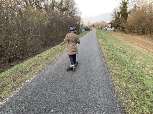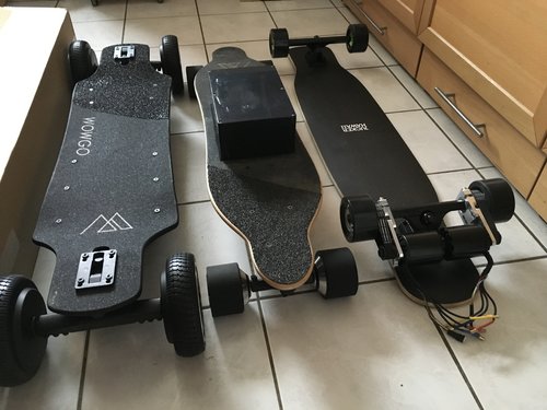 Familie hat sich heute vergrößert. Ruderboot ist endlich angekommen und hat dem WowGo 2S ein AT-Brüderchen (oder eher Schwesterchen) mitgebracht. Natürlich gleich mal angetestet von mir und (yes der E-Board Virus scheint zu wirken) meiner Frau. Also grundsätzlich fährt es sich ganz ordentlich. Aber......... Reifen ohne Luft (war aber klar, bei Hub-Motor), somit funktioniert das bei normalen und auch etwas ruppigeren Wegen, festen Feldwegen gut. Was mir nicht gefällt ist der Flex, der ist mir im Gegensatz zum S2, wo ich zu meinem üppigen Gewicht noch den Zusatzakku drauf habe (und das funktioniert super), zu weich. Bei steinigeren Wegen mit Steingrößen von ca. 3-4 cm wird es schon sehr eng unter dem Brett und ständiger Bodenkontakt ist angesagt. Wie das bei einer von WowGo angegebenen max. Traglast von 150 kg klappen soll, wage ich stark zu bezweifeln. Ich werde wohl die Achsen von unten montieren, denn das stört mich schon. Das Abrollen fühlt sich gut an, ist aber auch klar im Vergleich zu den Dünnschicht Hubs des S2. Beschleunigung ist etwas besser als beim S2. Allerdings anfahren auf etwas schwierigerem Untergrund könnte dynamischer sein (Power und Grip ist eben alles). Bei Max. Speed bin ich vom S2 etwas verwöhnt. Während ich mit dem S2 tatsächlich locker die von WowGo angegebene Höchstgeschwindigkeit erreiche (36-38 km/h sind locker drin), waren es beim AT heute max. 31 km/h. Während ich das S2 bis Max. Speed ohne irgendwelches wobbeln fahre, fängt das AT schon bei ca. 30 km/h an zu wobbeln. Ungewohntes Gefühl, gefällt mir nicht. Kann aber auch an der bisherigen Einstellung liegen, da hab ich noch nichts angepaßt, muss ich noch mal straffer ausprobieren. Im großen und ganzen also ein ordentliches Board mit den erwähnten Einschränkungen und m.E. nicht unbedingt geeignet, wenn man deutlich über die 100 kg Marke kommt. Das positivste an dem Board...........yes, meine Frau findet das Teil super. Während sie sich vehement dagegen wehrte, das S2 zu fahren (so nen Board ist nix für mich, ich warte lieber, bis mein Scooter kommt), findet sie das AT super geil. Aussagen wie „stehe super drauf, kann super lenken und ja Originalworte „es macht tierisch Laune“, Ich kann es gar nicht fassen. Ergo, mein neues heute gerade reingekommenes AT Board hat einen neuen (weiblichen) Besitzer. Hoffentlich läßt sie mich ab und an fahren, bis ich mein eigenes AT Board habe ;-). Habe noch paar Bildchen beigefügt. Von links: WowGo AT, WowGo S2 (mit Zusatzakku 10S7P), und (dem Beginn) meines ersten DIY-Board (zum üben). Jucker Hawai Danceboard 118, mit Dual AP 6384 S, 2 x VESC 6, Abbec 11 Flywheels (derzeit 90, ggf. später 97 oder 107, mal sehen). Und meine Frau heute beim E-Skaten (yes she can and love it). Hoffe, ich konnte mit meinen Infos bei der einen oder anderen Kaufentscheidung weiterhelfen.